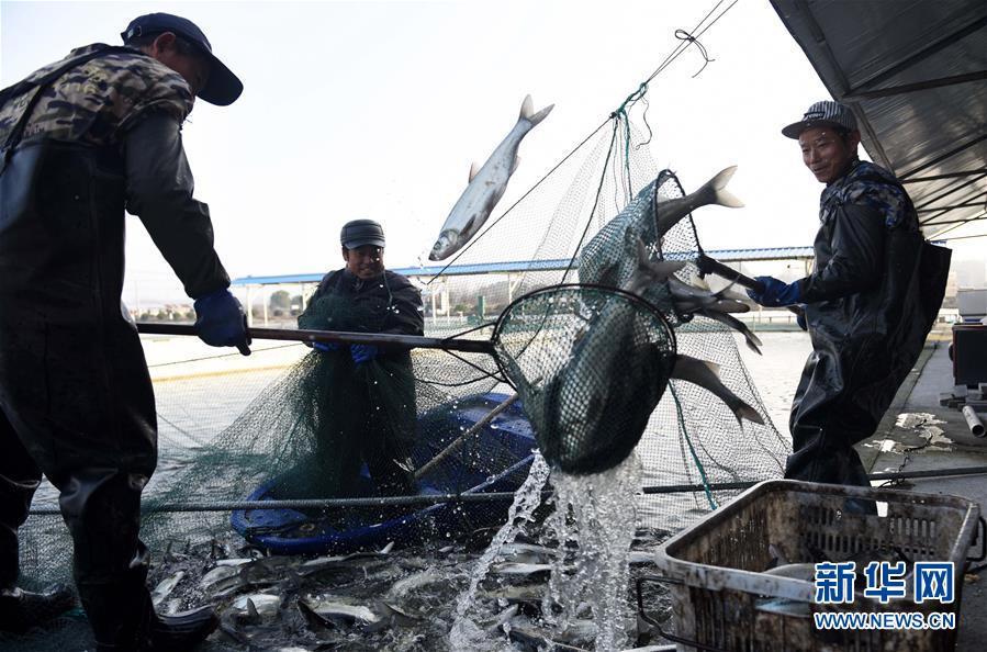 12月17日,在安徽铜陵一家渔业公司的循环流水养殖池塘里,工作人员在捕捞翘嘴鲌。 新华社发(过仕宁 摄)