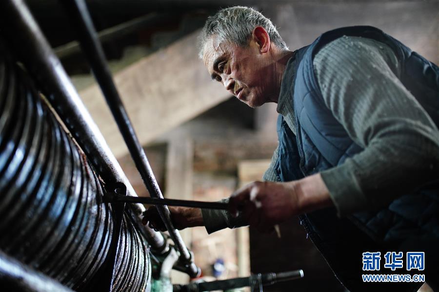 12月17日,在泗水乡里茶村,今年68岁的榨油师傅杨启清在调整茶饼位置。