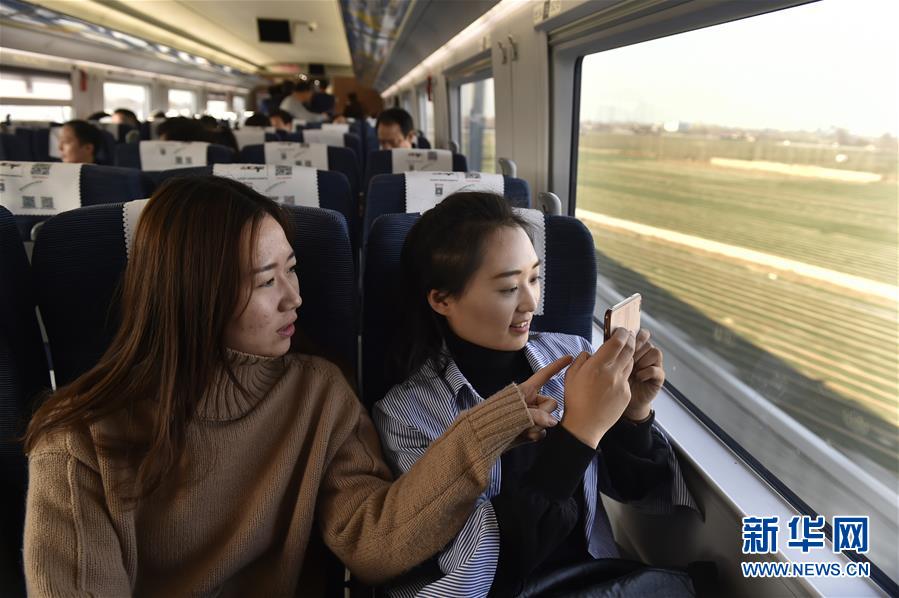 12月17日,试乘乘客在济青高铁列车上拍摄。