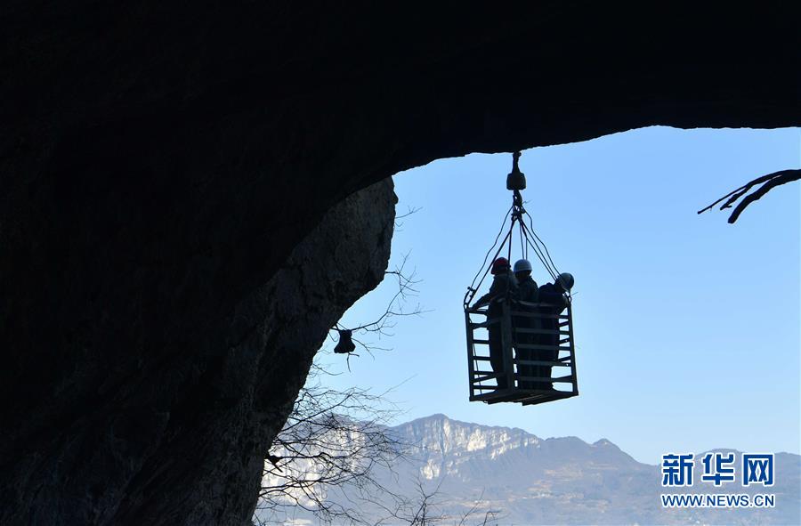 12月17日,工人坐铁吊篮到达天宝洞口。 湖北省恩施土家族苗族自治州恩施市屯堡乡田凤坪村位于朝东岩绝壁下方,这个村子是恩施市深度贫困村之一。每年10月到次年3月,当地降水减少,这个村就会面临缺水问题,近800名村民要四处找水喝。今年10月份,驻村扶贫工作队和村民组成探水队,在朝东岩绝壁中间——距岩底300多米、岩顶100多米的天宝洞内,寻得一处水源。经过一个月的铺设管道、送发管线等工作,清泉从山洞引出到达田凤坪村。由于从深洞水源处到建蓄水池的地方管道长2700米,这些水管是一百米一百米地拼接起来的,距离长、接头多,水管拼接处会因缝隙漏气影响管道内的压力导致断流。经过研究,探水队决定在绝壁上安装设施、架设线路,利用水泵抽水下山。目前,架线和安装变电设施的工程正在进行中。 新华社发(杨顺丕 摄)