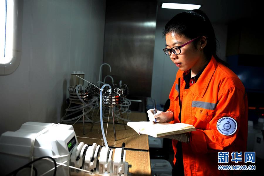 12月18日,来自中国科学院海洋研究所的博士后李小花在“沈括”号实验室工作。新华社记者 张建松 摄