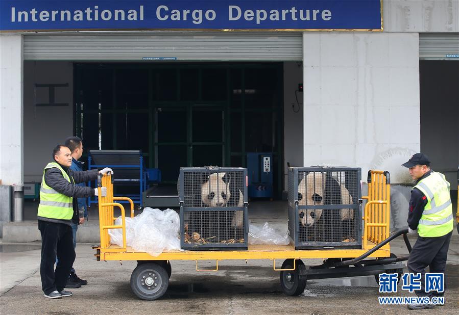 12月20日,大熊猫“华龙”和“回回”抵达黄山屯溪国际机场。 新华社发(施亚磊 摄)