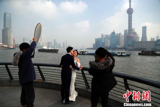 12月23日,新人选择在繁华的上海外滩拍摄婚纱照。时下,“婚纱摄影”已成为上海外滩一道亮丽的风景。