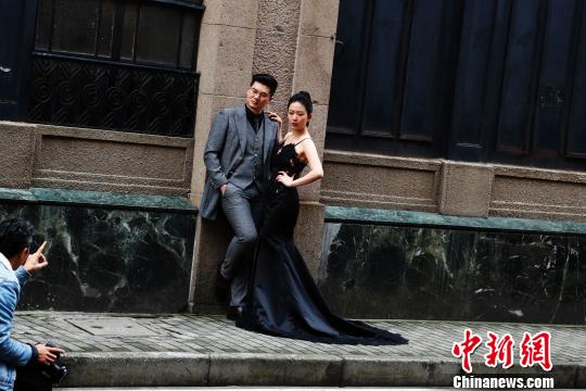 新人选择在繁华的上海外滩拍摄婚纱照。 汤彦俊 摄