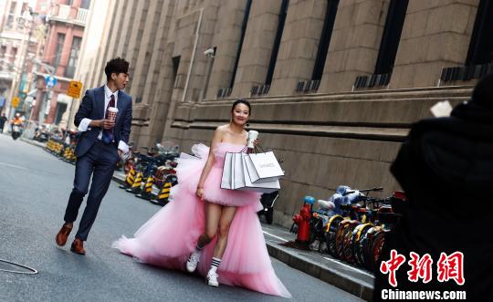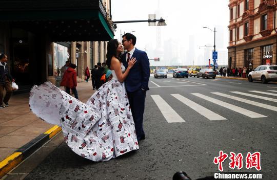 “婚纱摄影”成为上海外滩一道亮丽风景。 汤彦俊 摄
