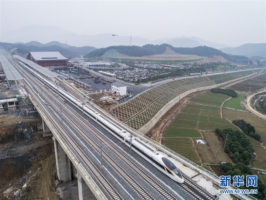 12月25日,杭黄高铁D9551次首发列车驶出浙江建德站(无人机拍摄)。 新华社记者 徐昱 摄