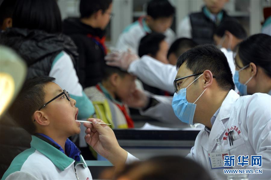 12月25日,在山东省茌平县贾寨镇中心小学,医务人员对学生进行口腔检查。 新年临近,山东省茌平县举行“迎新年健康礼包送学生”活动。医务人员携带医疗设备前往乡镇中小学,对学生进行耳鼻喉、口腔、眼科等项目的检查。 新华社发(赵玉国 摄)