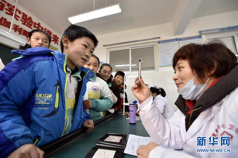 12月25日,在山东省茌平县贾寨镇中心小学,医生对学生进行眼科检查。 新年临近,山东省茌平县举行“迎新年健康礼包送学生”活动。医务人员携带医疗设备前往乡镇中小学,对学生进行耳鼻喉、口腔、眼科等项目的检查。 新华社发(赵玉国 摄)
