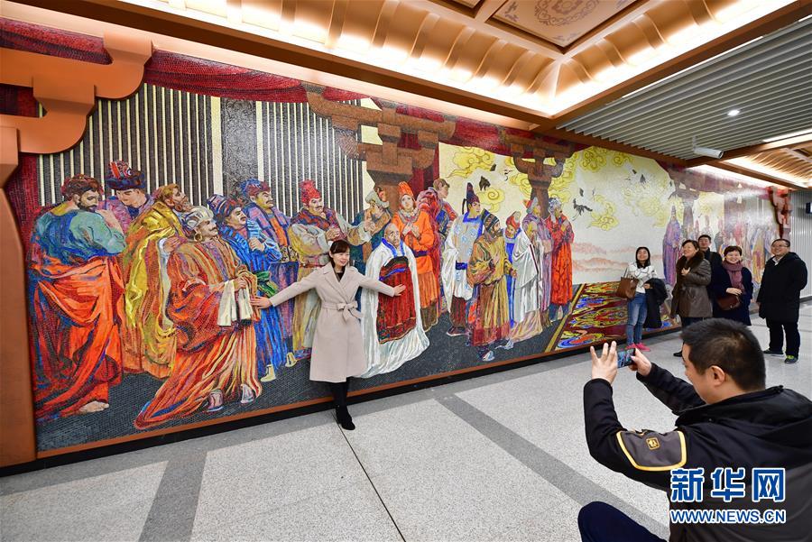 12月26日,乘客在西安地铁4号线大明宫站的文化墙前拍照。