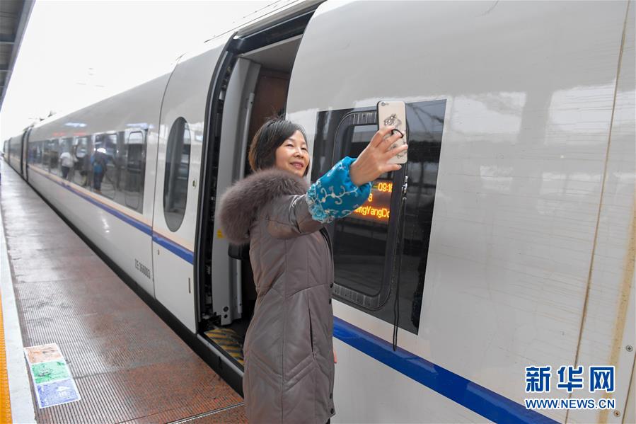 12月26日,在怀化南站,旅客在怀化开往衡阳的首发D9821次列车前自拍留念。 当日,怀化至衡阳铁路开通运营,湖南西南地区新增一条快速直达东南沿海和珠三角地区的“黄金通道”,使长沙、怀化、衡阳三市间形成新的高铁“金三角”。怀衡铁路经怀化、邵阳、衡阳三市14个县区,正线全长318公里,运营时速200公里。 新华社发(陈泽国摄)