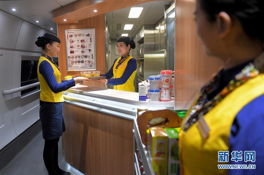 12月26日,怀化开往衡阳的首发D9821次列车乘务员在为乘客准备饮品。 当日,怀化至衡阳铁路开通运营,湖南西南地区新增一条快速直达东南沿海和珠三角地区的“黄金通道”,使长沙、怀化、衡阳三市间形成新的高铁“金三角”。怀衡铁路经怀化、邵阳、衡阳三市14个县区,正线全长318公里,运营时速200公里。 新华社发(陈泽国摄)