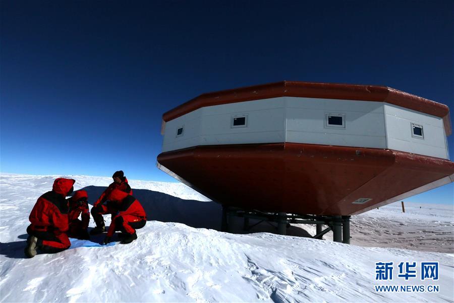 12月26日,泰山队队员进行泰山站二期工程定位放线。新华社记者 刘诗平 摄