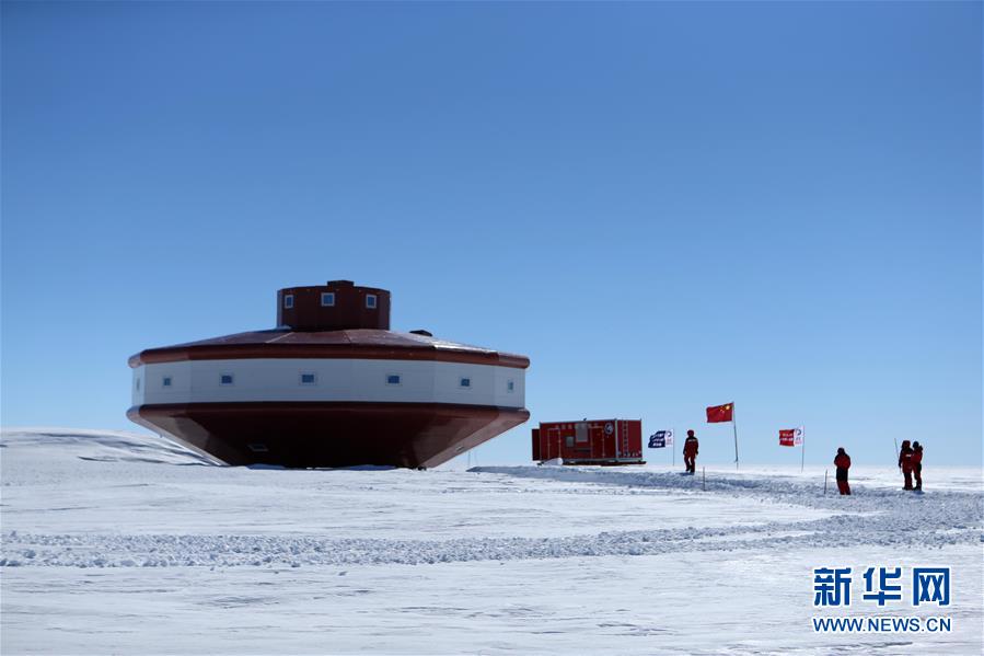 12月26日,中国第35次南极科学考察队内陆队(泰山队和昆仑队)队员在泰山站主体建筑前升国旗合影。新华社记者 刘诗平 摄