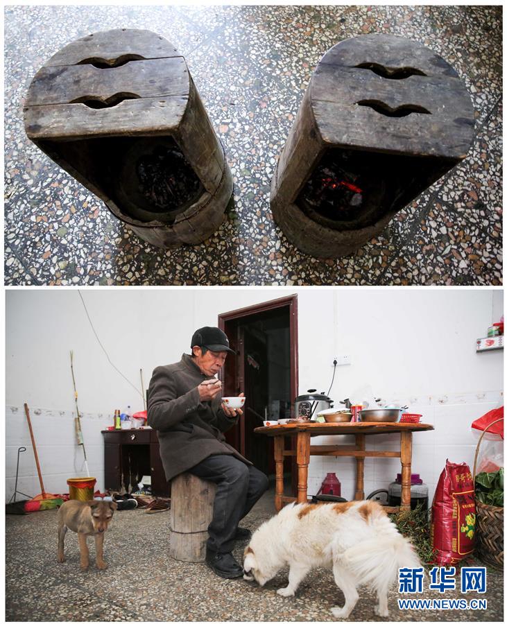 这是12月14日在湖南省隆回县三阁司镇龙河村一农户家拍摄的“火凳”和居民黄生维坐在“火凳”上吃饭的照片。