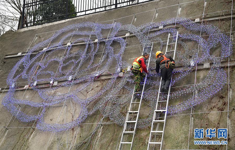 12月26日,工人在西安市曲江新区街头安装灯饰。 新年将至,在陕西省西安市曲江新区,工人抓紧用各色现代化的节能灯饰点缀街头,营造节日氛围。 新华社记者 邵瑞 摄