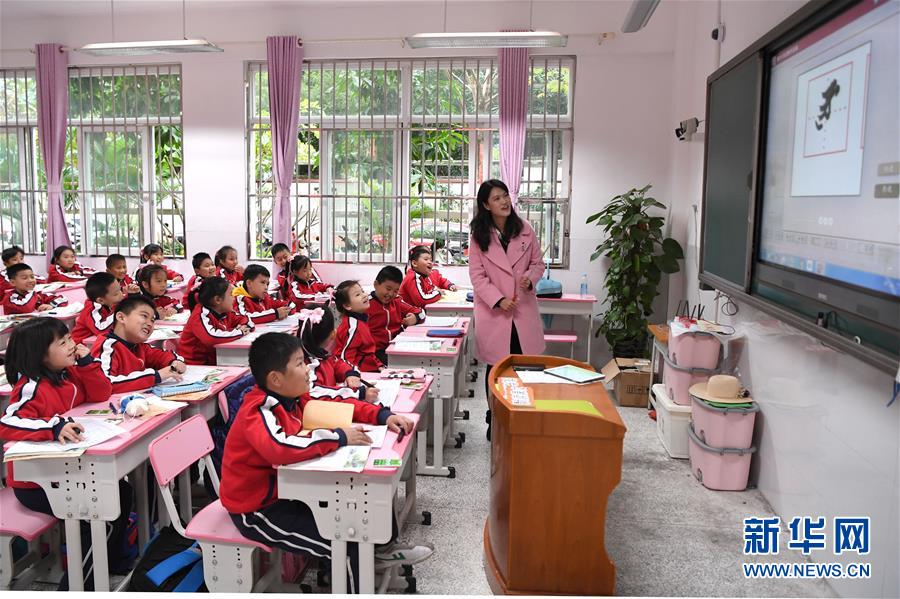 12月27日,南宁市玉兰路小学的学生在录播教室利用录播功能回看一名同学“柔”字书写过程。当日,广西170多名中小学教育工作者前往南宁市玉兰路小学,参观该校智慧教育示范学校现代化信息系统。该系统由录播教室、创客教室、智慧教室、数字书法教室、智能阅读机等构成,将实体展示和网络动画展示相结合,大大增强了课堂教学的互动性和趣味性。新华社记者 周华 摄