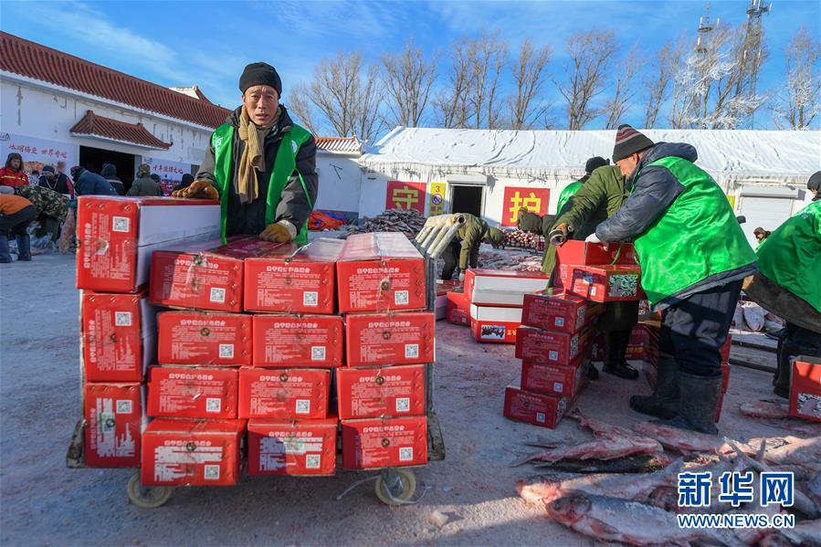 12月27日,在吉林松原查干湖渔场,工人们将鱼装箱。 随着吉林松原查干湖冬捕知名度不断提高,全国各地消费者对查干湖鱼的需求量逐年增大。2014年开始,多个电商平台和快递企业纷纷抓住商机进驻查干湖。经过多年发展,借助互联网销售优势和日趋完善的快递网络,全国多地的百姓可以在鱼出水后的48小时内品尝到查干湖鱼的鲜美滋味。 新华社记者张楠摄