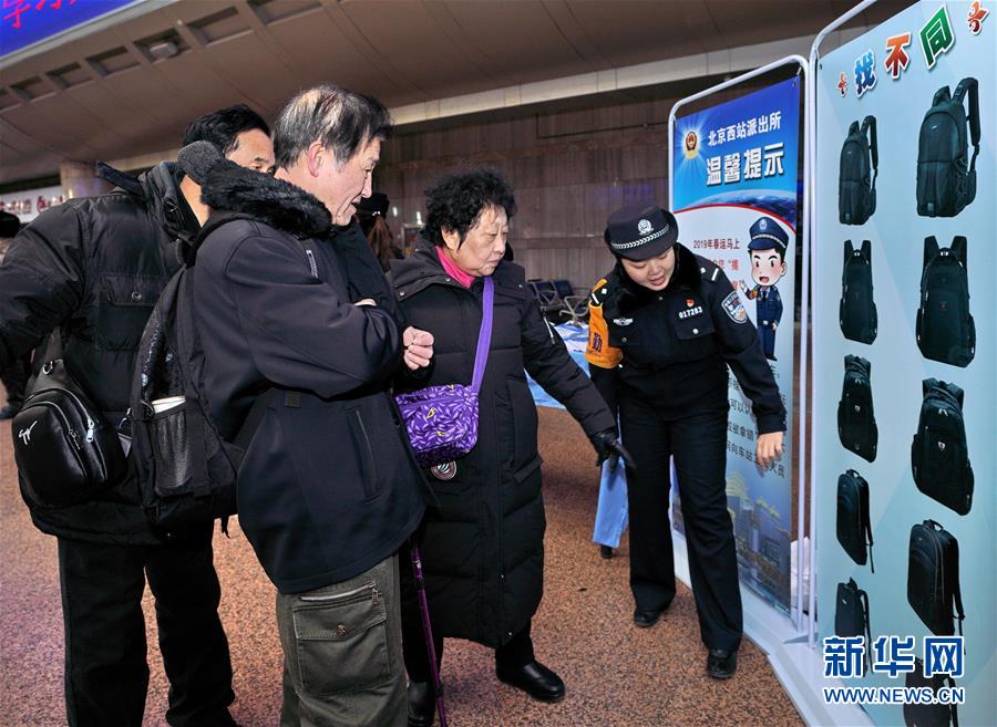 12月28日,北京铁路公安局西站派出所民警在给旅客介绍防止双肩背拿错和防盗知识。
