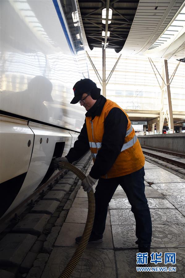 12月28日, 北京动车段北京南站吸污组工人王建秋在给列车进行排污。
