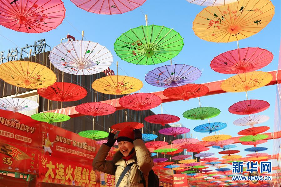 近日,安徽省淮北市一广场被色彩斑斓的油纸伞装饰,浓浓的迎新年气氛吸引了众多市民前来。
