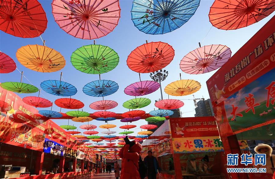 近日,安徽省淮北市一广场被色彩斑斓的油纸伞装饰,浓浓的迎新年气氛吸引了众多市民前来。