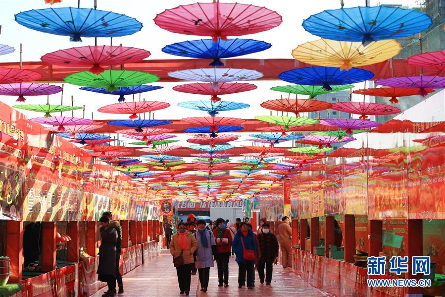 近日,安徽省淮北市一广场被色彩斑斓的油纸伞装饰,浓浓的迎新年气氛吸引了众多市民前来。