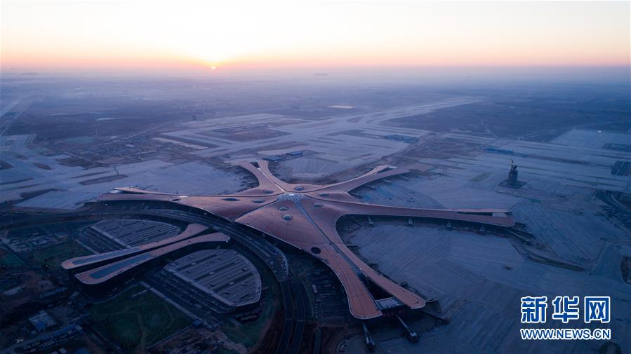 12月29日拍摄的北京大兴国际机场(无人机拍摄)。 当日,在北京大兴国际机场,随着清晨第一缕阳光洒在航站楼古铜色的屋顶上,寓意“凤凰展翅”的航站楼呈现出金光灿灿的景象。截至12月28日,北京大兴国际机场主航站楼外立面装修工程全面完成,正式对外完整亮相。 新华社记者 鞠焕宗 摄
