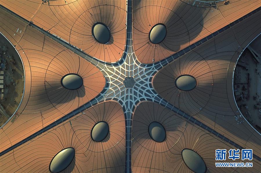 12月29日拍摄的北京大兴国际机场主航站楼(无人机拍摄)。 当日,在北京大兴国际机场,随着清晨第一缕阳光洒在航站楼古铜色的屋顶上,寓意“凤凰展翅”的航站楼呈现出金光灿灿的景象。截至12月28日,北京大兴国际机场主航站楼外立面装修工程全面完成,正式对外完整亮相。 新华社记者 鞠焕宗 摄