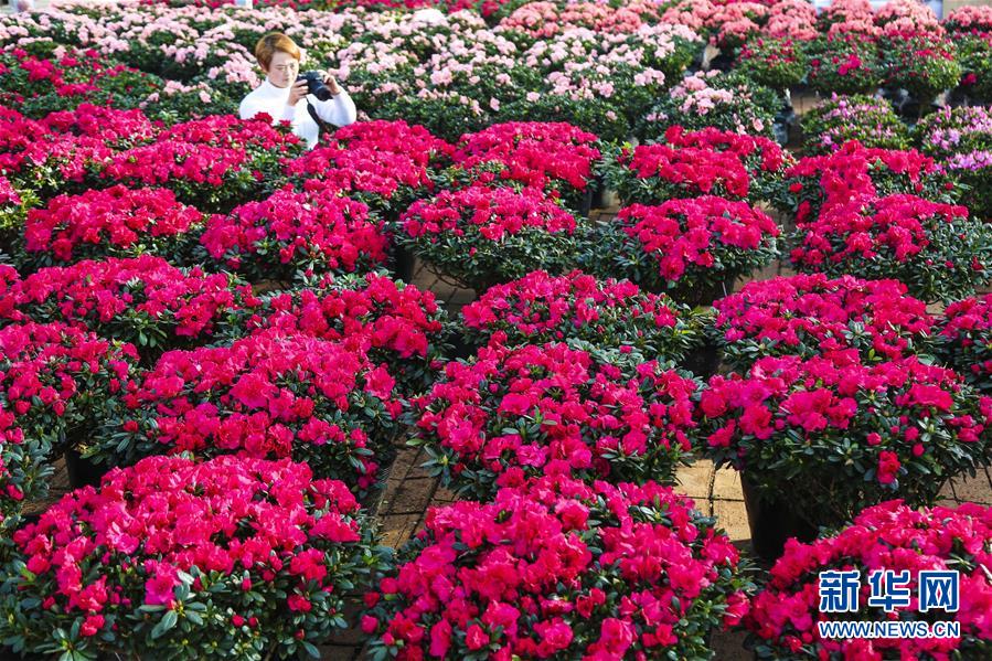 12月29日,顾客在永清县恒都美业花市拍摄杜鹃花。 元旦将至,河北省永清县的花卉市场买卖红火。近年来,永清县调整农业产业结构,发展花卉产业,已建成占地3万余平方米的大型室内花卉市场,入驻花商200余家,带动全县鲜花种植规模达1万余亩,年产值超过1亿元。 新华社记者 李晓果 摄