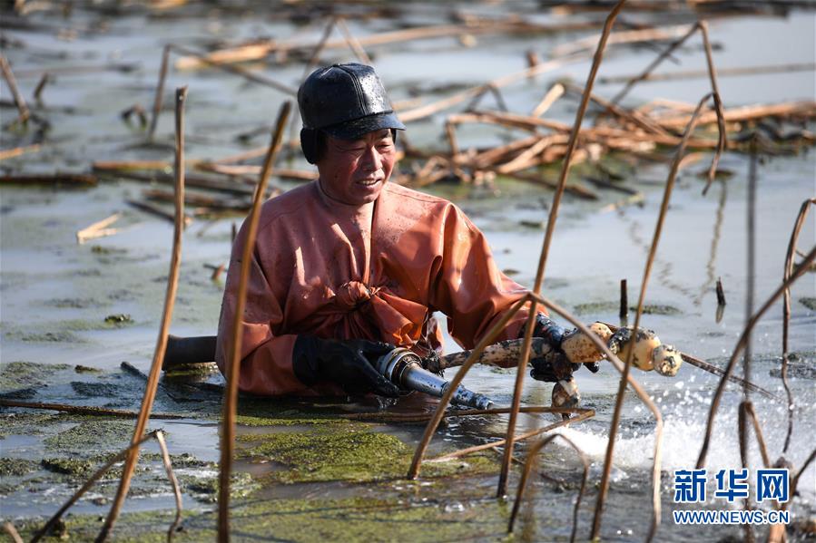 王公平每天泡在冰冷的水中劳动9个小时,挖藕约1000斤,获得酬劳约300元。 寒冬时节,安徽省肥西县丰乐镇莲藕种植基地里活跃着不少挖藕人,他们身穿橡胶工作服,在冰冷的水中辛勤工作。