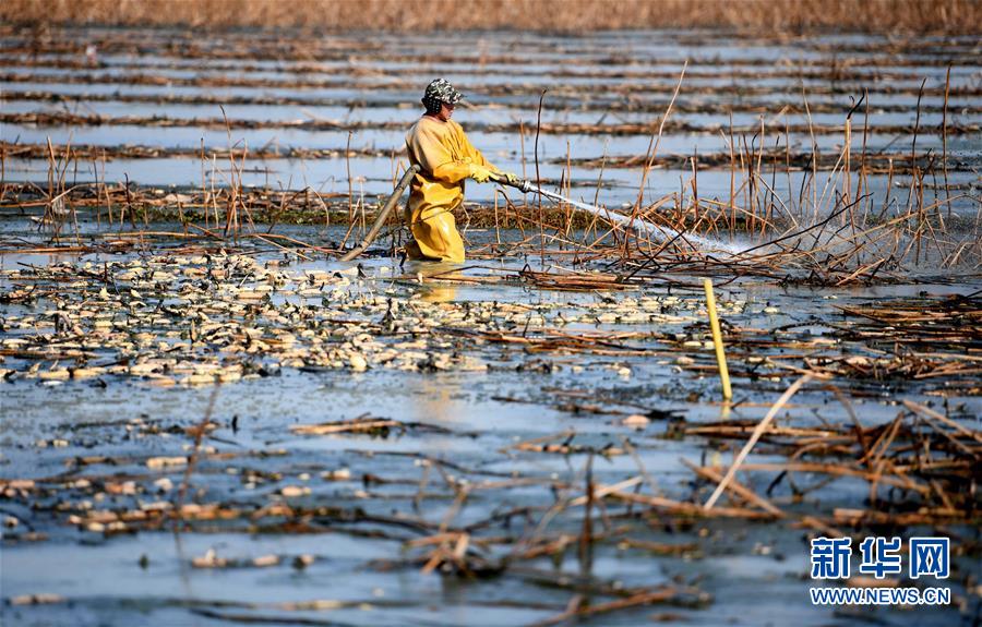 12月29日,来自淮南的挖藕人张作志在肥西县丰乐镇一莲藕种植基地用高压水枪冲掉冰层。 新华社记者 刘军喜摄