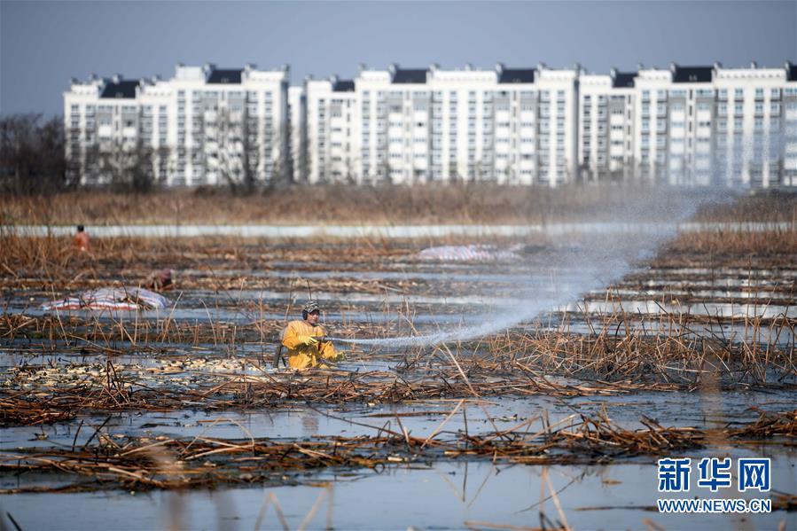 12月29日,来自淮南的挖藕人张作志在肥西县丰乐镇一莲藕种植基地用高压水枪冲掉冰层。新华社记者 刘军喜摄