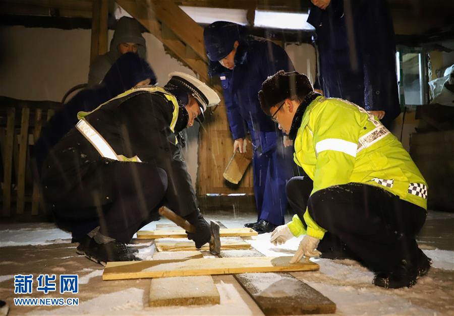 12月30日凌晨4时42分,在贵州省丹寨县扬武镇干改村党卡苗寨,交警队员和消防应急队员在制作临时简易担架。新华社发(陆德华 摄)