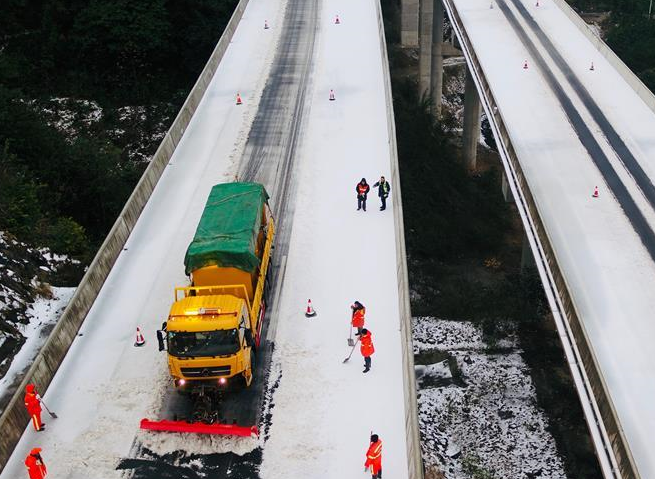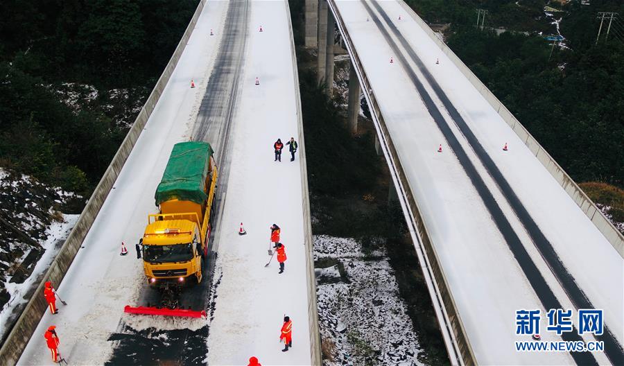 12月30日,在广西桂三高速公路柳州三江段,工人们在桥面上进行除雪作业(无人机拍摄)。近日,我国多地迎来降雪天气,各地公路、环卫、公安交警等部门积极采取应对措施,保障交通安全。新华社发(黎寒池 摄)