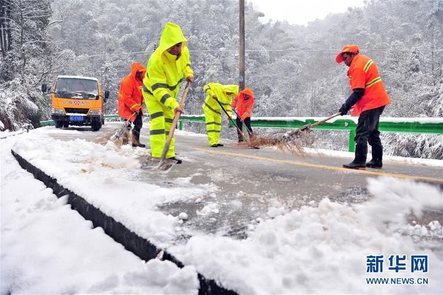 12月30日,公路养护人员在江西省万载县境内公路上清除积雪。近日,我国多地迎来降雪天气,各地公路、环卫、公安交警等部门积极采取应对措施,保障交通安全。新华社发(邓龙华 摄)
