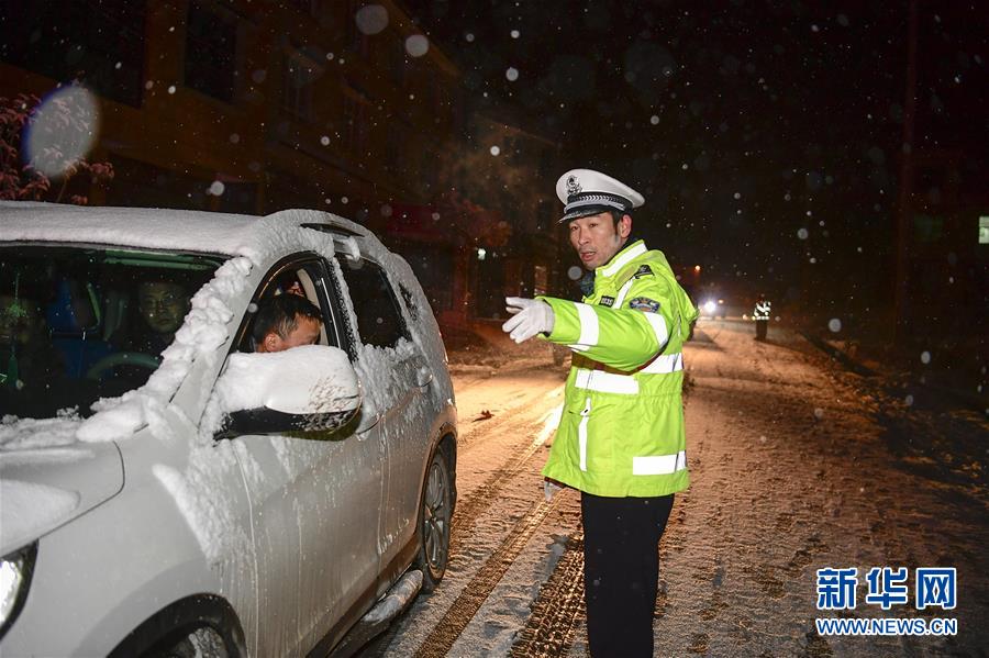 12月29日晚,在湖北省恩施土家族苗族自治州来凤县境内353国道竹坝段,交警提醒司机保持车距缓慢通行。近日,我国多地迎来降雪天气,各地公路、环卫、公安交警等部门积极采取应对措施,保障交通安全。新华社发(唐俊 摄)