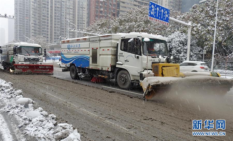 12月30日,在湖北武汉汉口新华路,环卫工人驾驶车辆清除路面积雪。近日,我国多地迎来降雪天气,各地公路、环卫、公安交警等部门积极采取应对措施,保障交通安全。新华社发(李长林 摄)