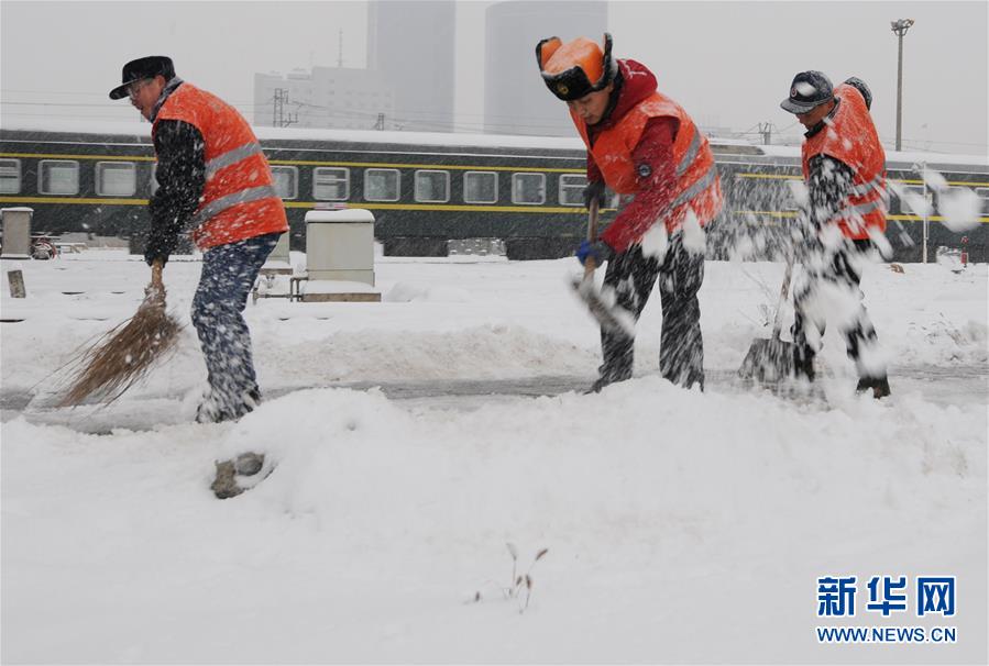 12月30日,江西南昌车辆段的职工在九江市濂溪区铁路客技站扫雪除冰。近日,我国多地迎来降雪天气,各地公路、环卫、公安交警等部门积极采取应对措施,保障交通安全。新华社发(胡国林 摄)
