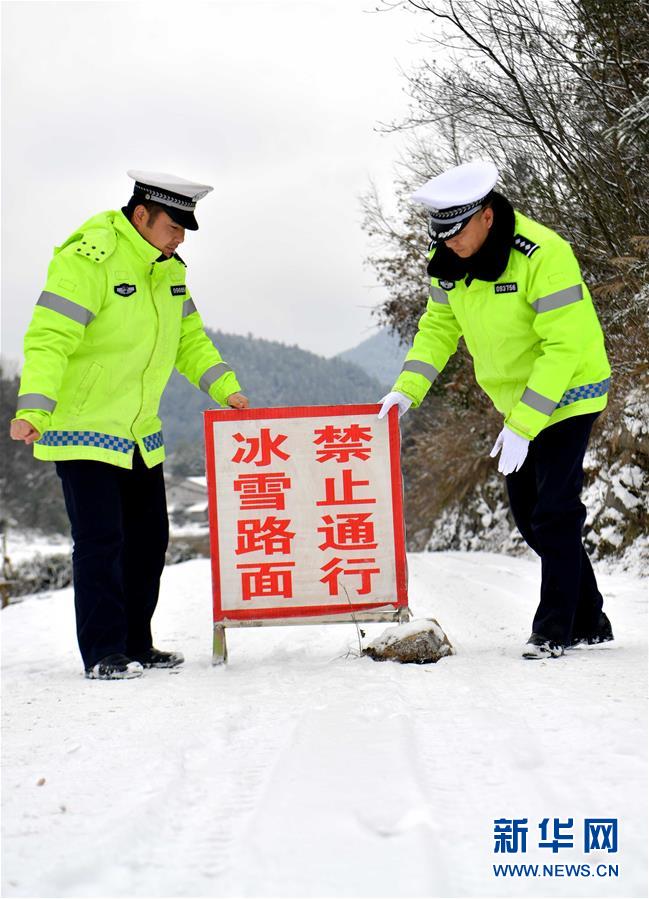 12月30日,湖北省恩施市公安局民警在危险路段放置警示牌。近日,我国多地迎来降雪天气,各地公路、环卫、公安交警等部门积极采取应对措施,保障交通安全。新华社发(杨顺丕 摄)