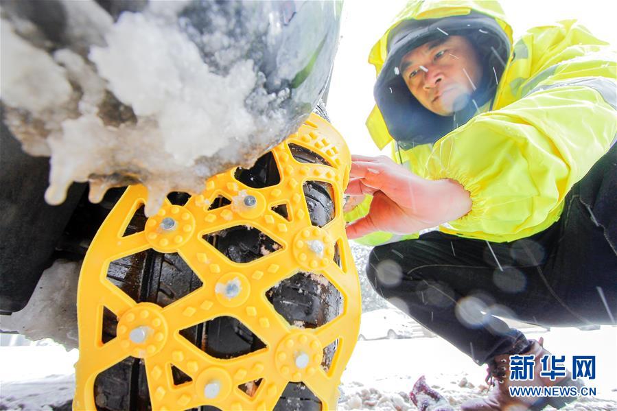 12月30日,路政人员在湖南省隆回县境内隆武公路三阁司段给上路的车辆上防滑链。近日,我国多地迎来降雪天气,各地公路、环卫、公安交警等部门积极采取应对措施,保障交通安全。新华社发(曾勇 摄)