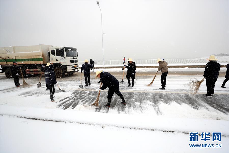 12月30日,工作人员在江西九江共青城市一处桥面上扫雪除冰。近日,我国多地迎来降雪天气,各地公路、环卫、公安交警等部门积极采取应对措施,保障交通安全。新华社发(况建 摄)