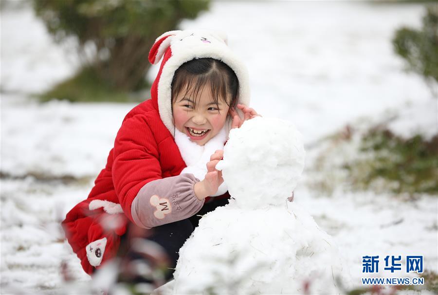 12月30日,在湖南省衡阳市,一名小女孩在南华大学校园里堆雪人。