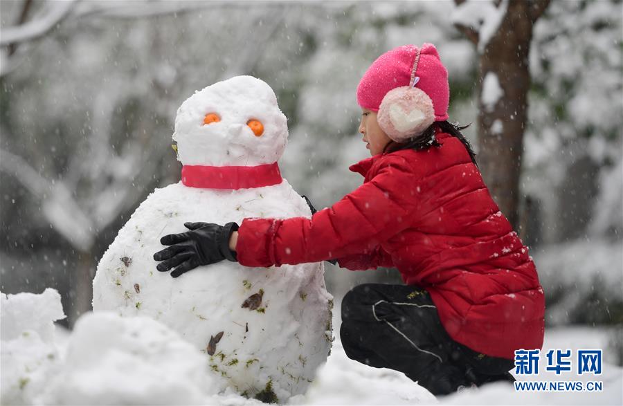 12月30日,在湖南长沙浏阳市城区,一名女孩在雪中堆雪人。 新华社发(彭红霞 摄)
