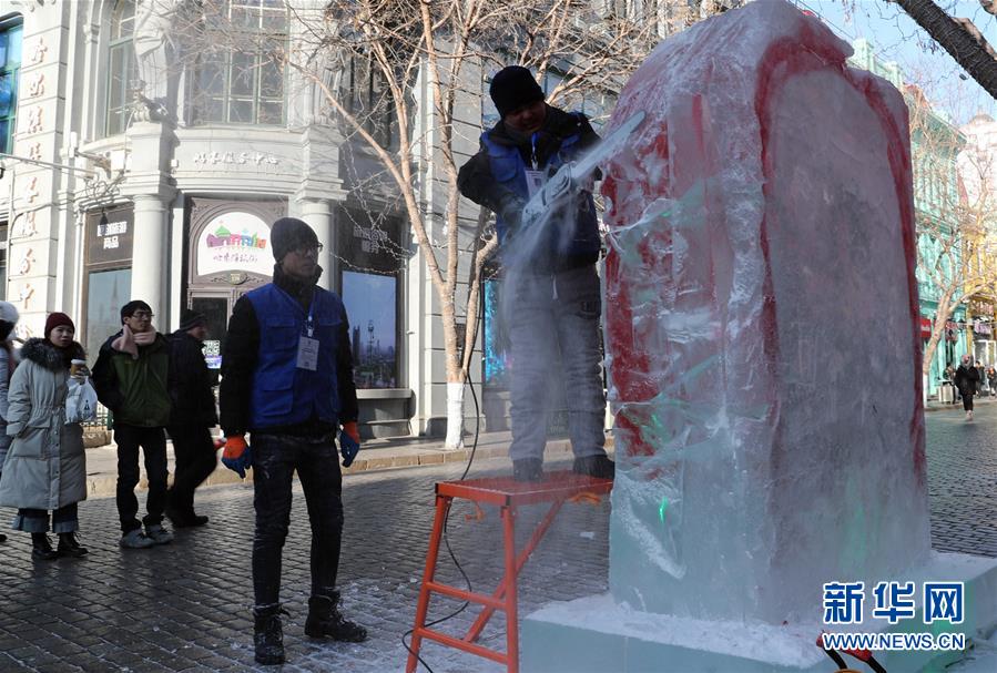 12月30日,参赛选手创作冰雕作品。当日,2018年全国高校冰灯冰雕艺术创新设计大赛暨2018年黑龙江省高校冰灯冰雕艺术创新设计大赛在哈尔滨市中央大街举行。新华社记者 曹霁阳 摄