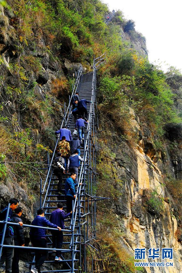在四川省凉山彝族自治州昭觉县,人们沿着刚建好的钢梯登上“悬崖村”(2016年11月29日摄)。