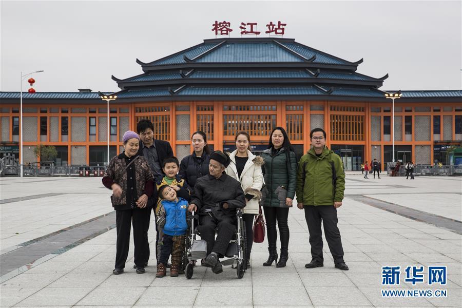 2015年2月23日,在贵州省榕江县古州镇贵广高铁榕江站前,黄万鑫(右一)和家人拍摄全家福。新华社发 黄万鑫 摄 图片来源:新华网