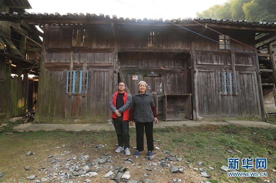 2016年12月15日,在贵州省榕江县崇义乡大塘村自家的老屋被拆除前,黄万鑫和母亲在老屋前留影。新华社发 黄万鑫 摄 图片来源:新华网