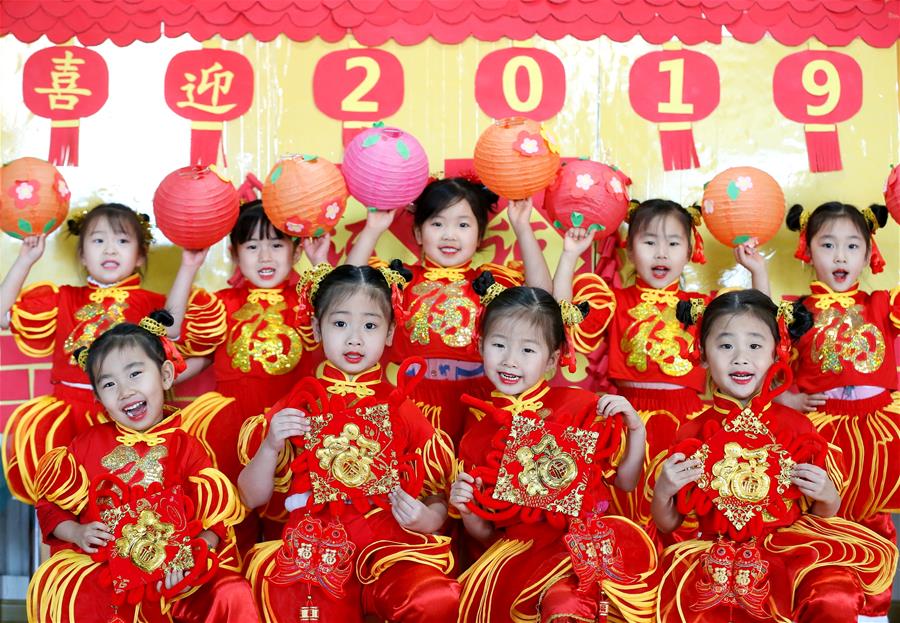 2019年1月1日,在山东青岛即墨通济新经济区由和幼儿园,小朋友们身着节日服装,庆祝2019年的到来。 新华社发(梁孝鹏 摄)
