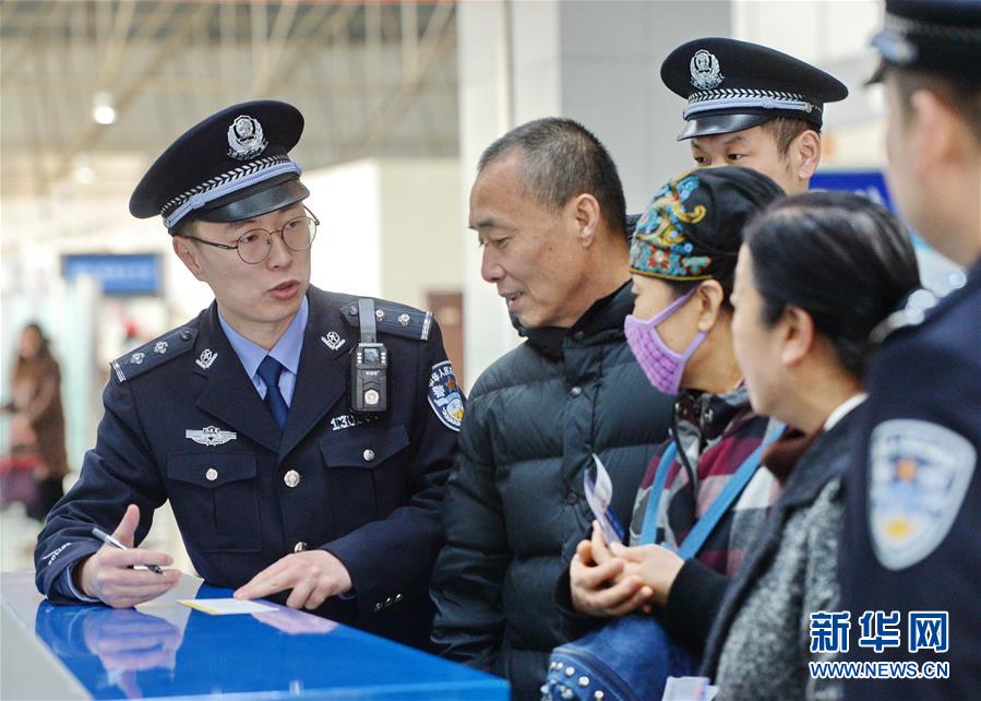 1月1日,石家庄出入境边防检查站民警王悦峰(左)为旅客讲解出境有关注意事项。 当日起,全国出入境边检机关全员统一换着人民警察制服上岗执勤,以全新形象为出入境旅客提供通关服务。 新华社记者 杨世尧 摄