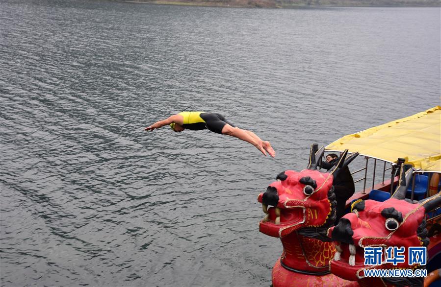 2019年1月1日,浙江省建德市一名冬泳爱好者跃入江水中。当日是新年第一天,冬泳爱好者在水中畅游,迎接新年的到来。新华社发(宁文武 摄)
